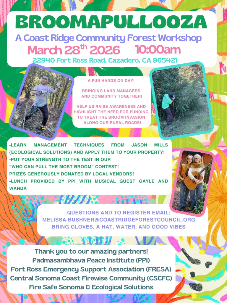 - Bodega Head State Park – Second Sunday of each month from 10:00 AM – 1:00 PM. Contact Alynn at: alynnkjeldsen@gmail.com